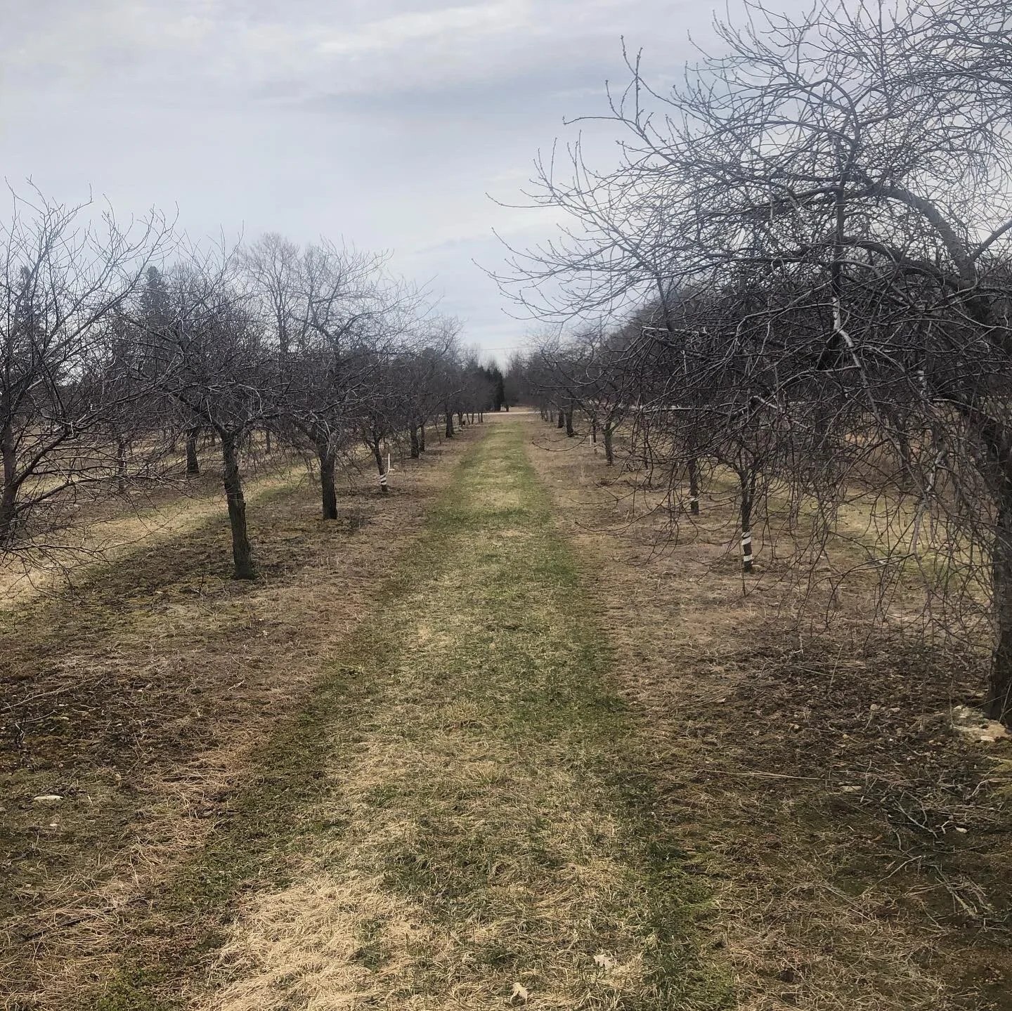 View from a tractor in an orchard, with leafless trees lining a grassy path, under a cloudy sky.