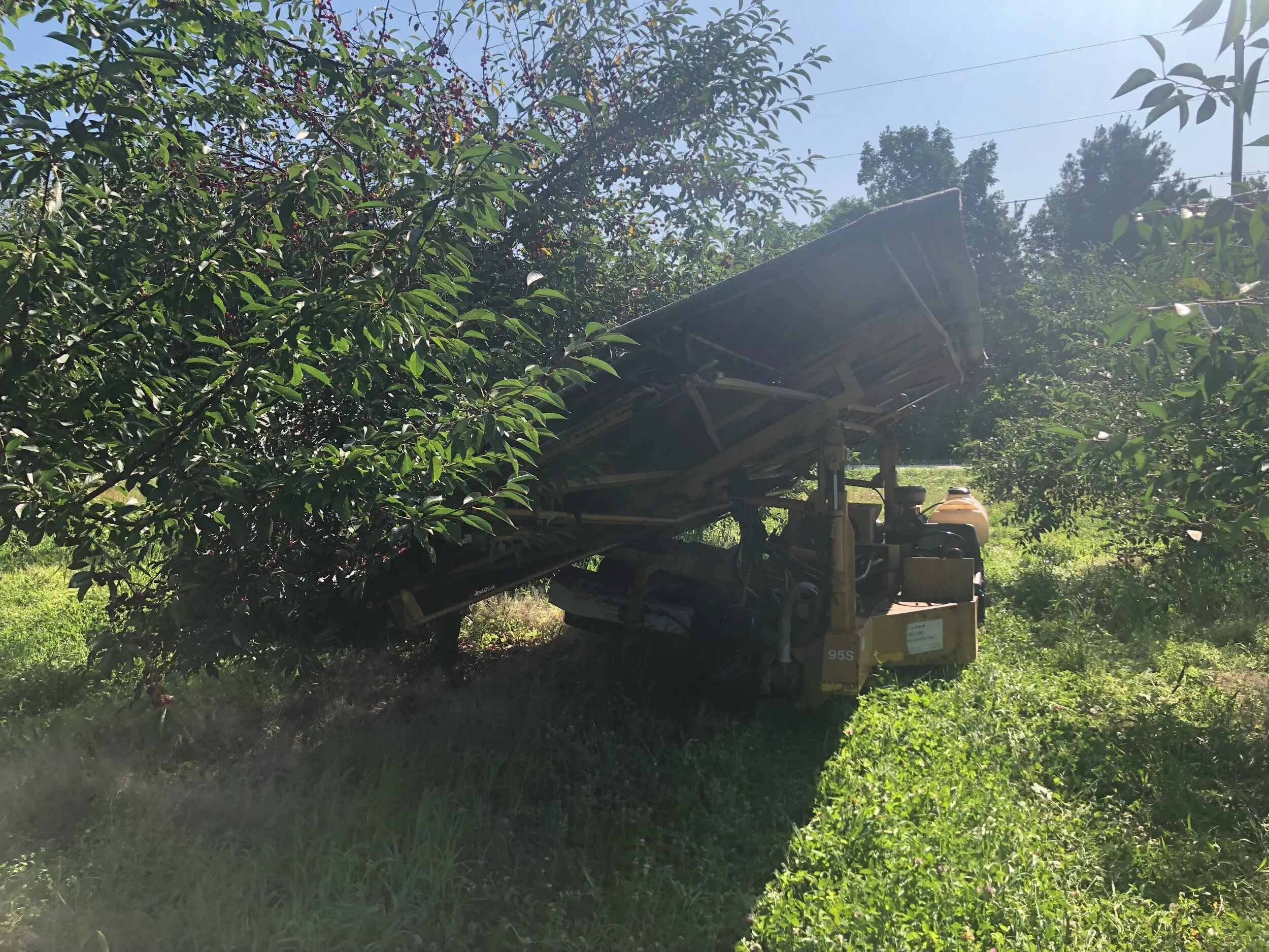 A mechanical harvester machine in an orchard full of green trees, with a blue sky and some clouds overhead.