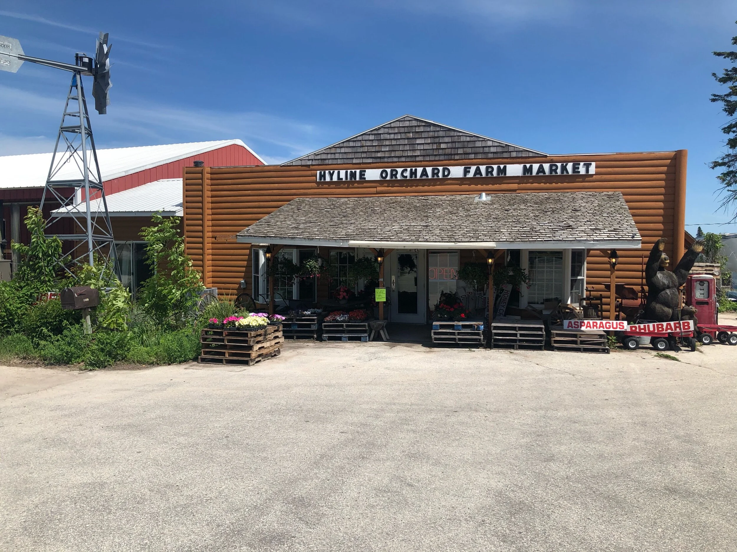 Front view of Hyline Orchard Farm Market building with plants and flowers outside, a sculpture of a bear holding a honey jar, and a sign indicating asparagus and rhubarb for sale.