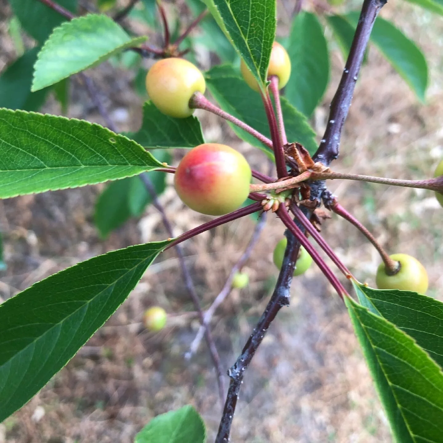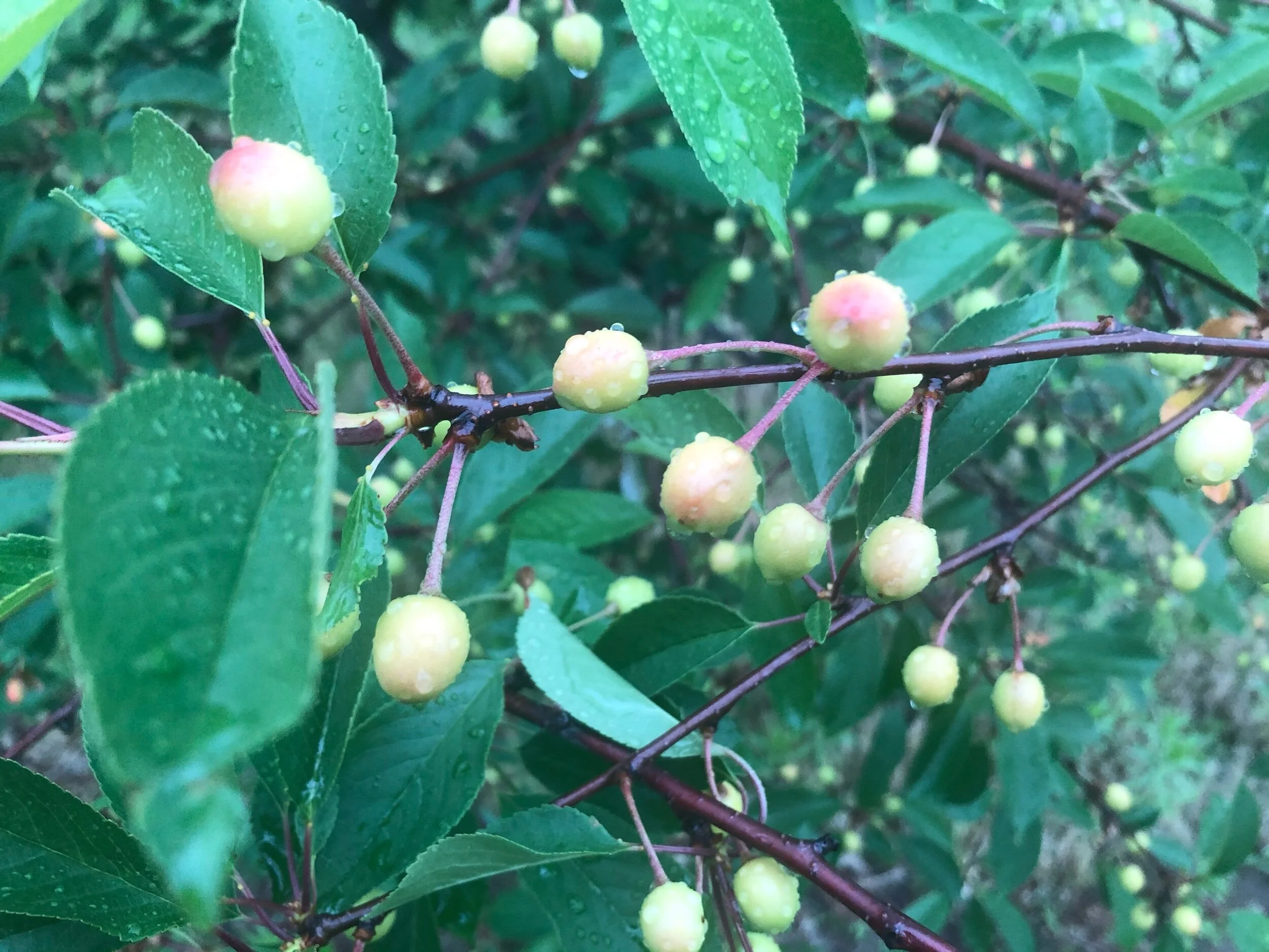 Close-up of a branch with green leaves and small, round, ripening cherries.