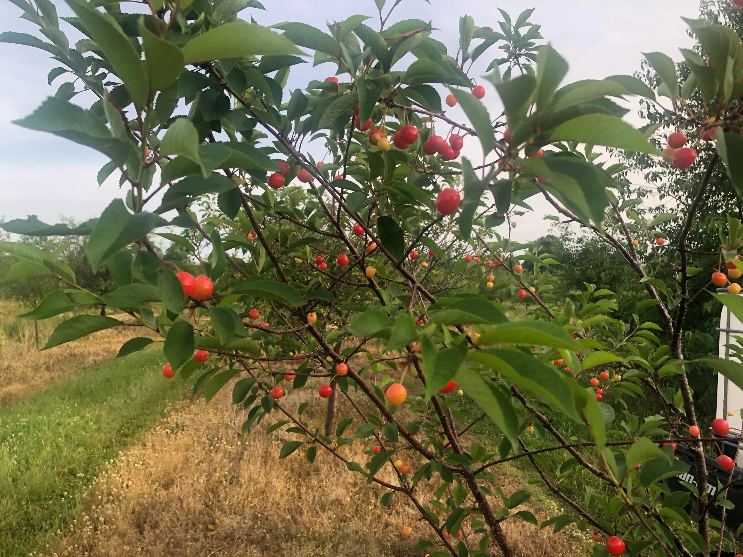 Cherry tree with ripening red and yellow cherries in a farm setting.