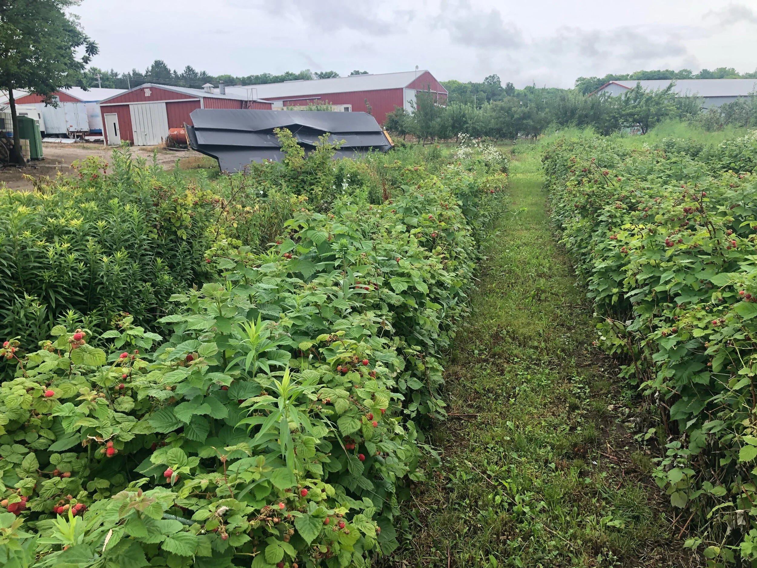 Rows of raspberry bushes in a farm field with a barn and cloudy sky in the background.