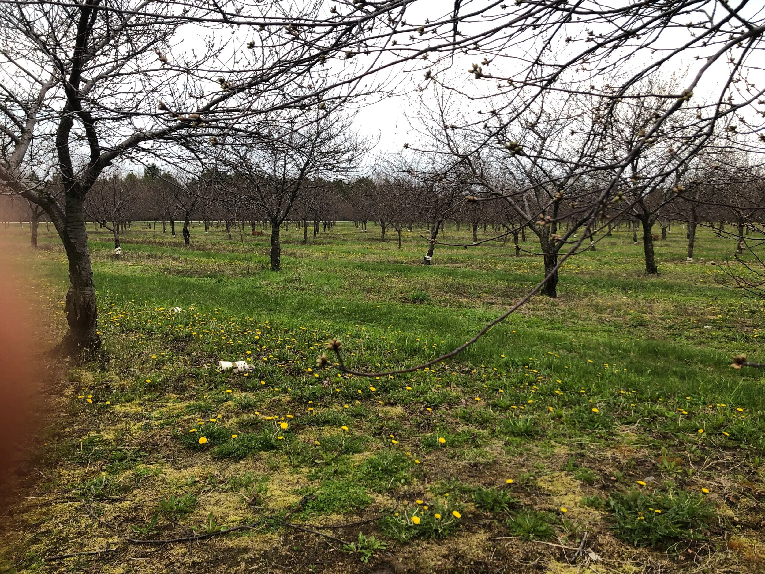A leafless orchard with rows of fruit trees, some white plastic bands around the trunks, yellow wildflowers, green grass, and a cloudy sky.