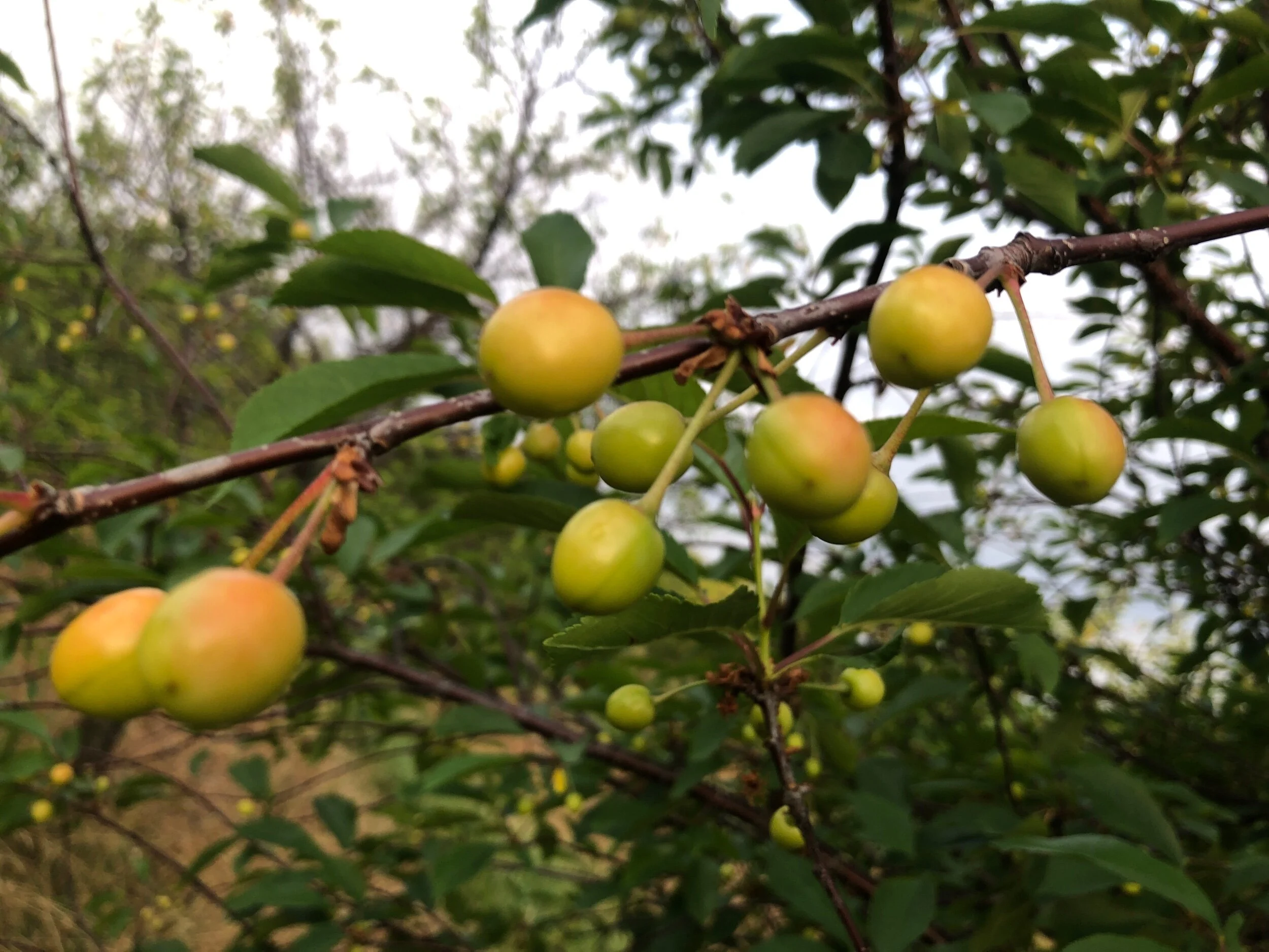 Ripe and unripe cherries hanging from a tree branch surrounded by green leaves, with a blurry background of grass and plants.